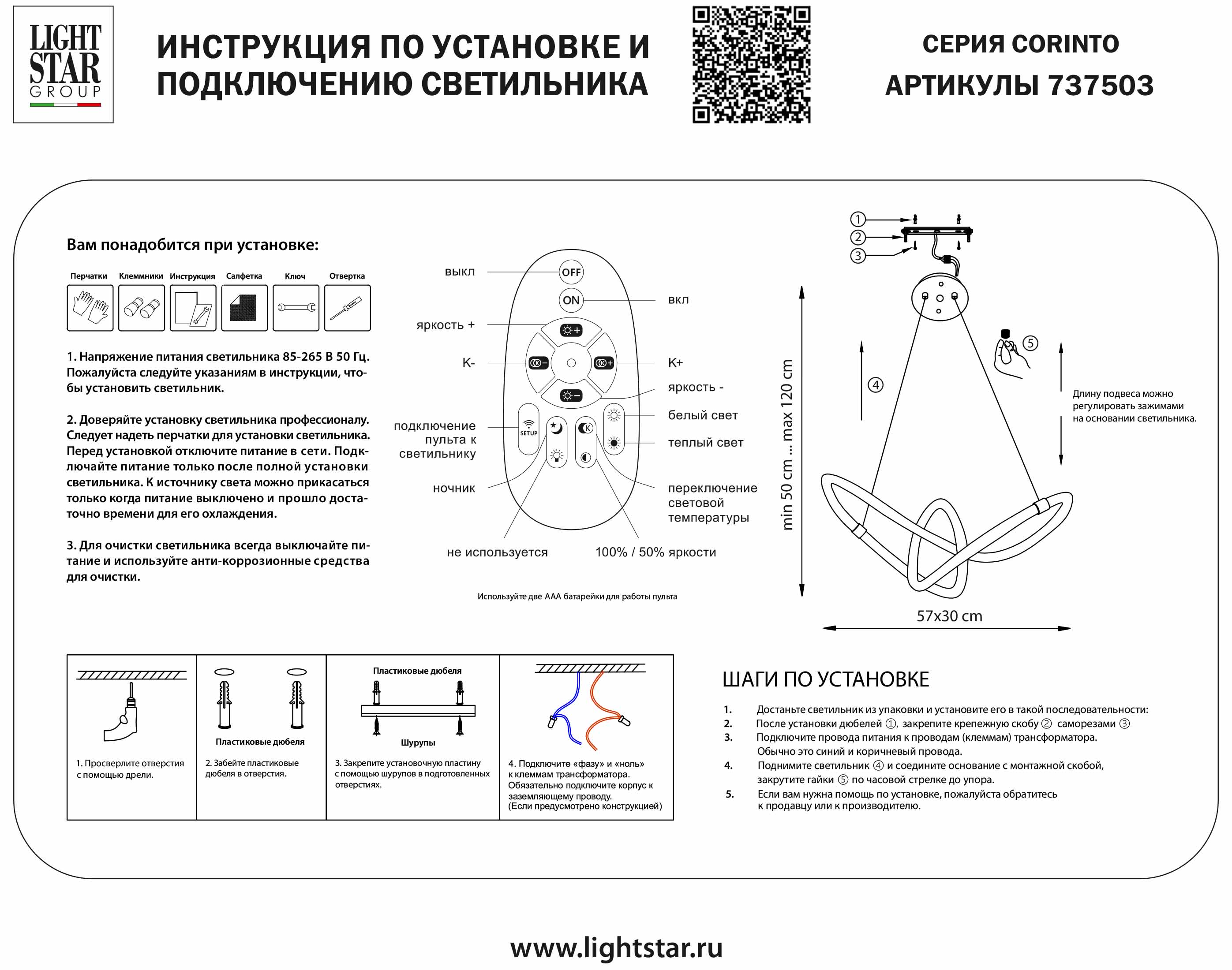 Светильник оснащён встроенными светодиодами мощностью 35 Вт и предлагает возможность регулировки яркости (диммирование) и цветовой температуры от 3000 до 6000 К. Управление осуществляется с помощью пульта, который входит в комплект, что делает использование максимально удобным.